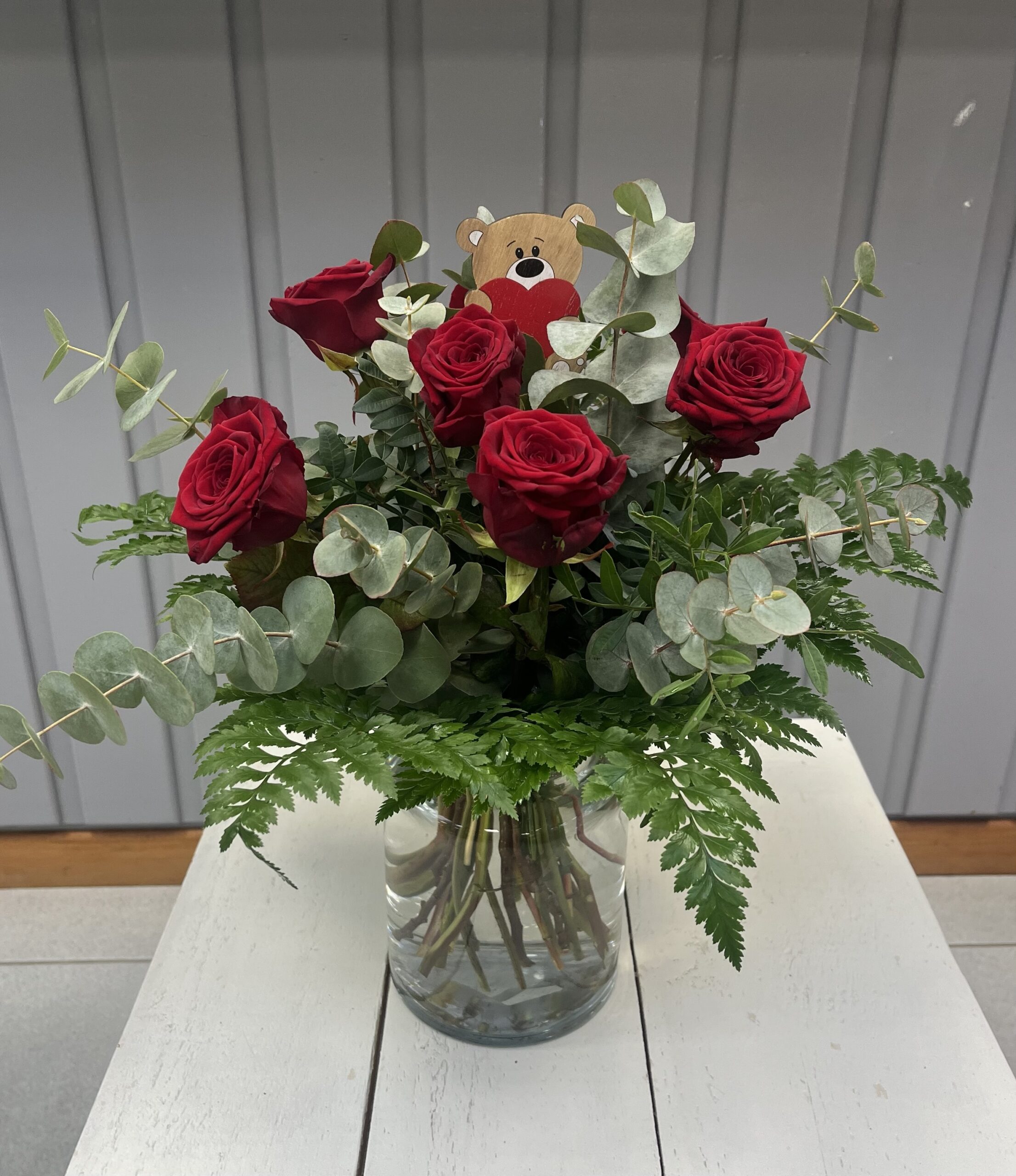 7 magnifiques roses rouges Red Naomi dans un vase en verre
